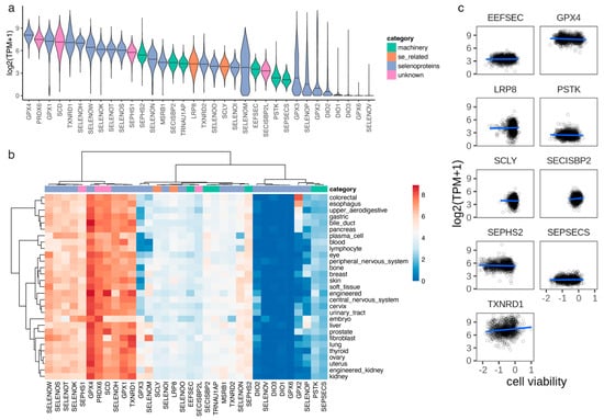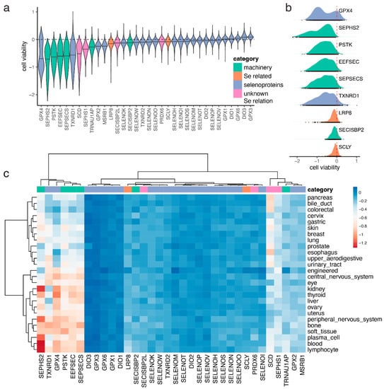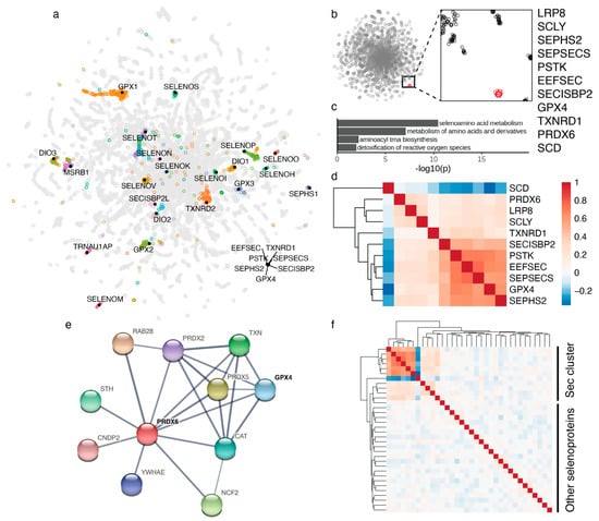 The human genome encodes 25 selenoproteins and 7 well-established and several additional candidate Sec machinery proteins, as well as one Sec-specific tRNA []. We analyzed here the co-essentiality network to identify the functional partners of selenoproteins and proteins comprising the Sec machinery. We found a remarkable cluster that included all seven known genes required for the biosynthesis and insertion of Sec, two critical selenoproteins, GPX4 and TXNRD1, and two additional proteins, PRDX6 and SCD. We also analyzed the essentiality scores of knockouts of the proteins in this cluster across one thousand cancer cell lines and found that the proteins involved in the metabolism of Sec are strongly selective for a subset of primary tissues, suggesting that specific cancer cell lineages were particularly dependent on selenium. An additional well-defined cluster included selenophosphate synthetase SEPHS1, which is not involved in Sec machinery. We discuss how the co-essentiality network can identify new functional partners, thereby clarifying the role of selenium in biology and medicine.
