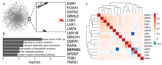 SEPHS1 clusters with a breast cancer-specific gene module that contains ESR1, the estrogen receptor (ER), which is overexpressed in breast cancers and enables hormone-dependent growth, and several other genes that functionally interact with ESR1, including transcriptional regulators in ER-dependent breast cancers SPDEF, FOXA1, and GATA3 [].