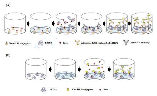 Schematic diagrams of (A) the icELISA and (B) cELBIA using biOVA. (A) The biOVA competitively reacted with the free Kwa or Kwa on the Kwa-HSA conjugates and biOVA binding to Kwa-HSA conjugates were continuously detected by anti-OVA antibody and HRP-labeled anti-mouse IgG1 goat antibody. (B) The free Kwa and Kwa-HRP conjugates competitively reacted to the immobilized biOVA. Binding of the Kwa-HRP conjugates to biOVA was detected.