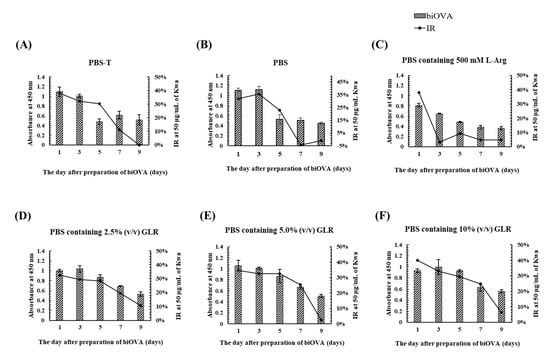 To investigate the effects of a dialysis buffer on the stability of biOVA during its preparation, various PBS-based dialysis buffers (PBS-T, PBS containing 500 mM L-arginine (Arg), and PBS containing 2.5–10% (v/v) GLR) were used at 4 °C during the final step of biOVA preparation. Furthermore, time-dependent absorbance values and IR were evaluated by iELISA and icELISA, respectively, performed at 1, 3, 5, 7, and 9 days after preparation of the biOVA (Figure 4). The absorbances for PBS-T, PBS, and PBS containing Arg decreased at 5 days, whereas both the absorbance and IR for PBS containing 2.5–10% (v/v) GLR decreased at 7 days. When the changes in IR from 5 to 7 days were compared among three GLR concentrations, the IR was found to decrease by ~10% for PBS containing 2.5% (v/v) GLR, whereas it decreased by ~5% for the others. Because a similar pattern was observed for PBS containing 5% and 10% (v/v) GLR, PBS containing 5% (v/v) GLR was selected as a dialysis buffer. These results also indicated that the biOVA was stable for 5 days at 4 °C when PBS containing 2.5–10% (v/v) GLR was used as a dialysis buffer.