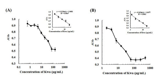 Under optimized conditions, the icELISA and cELBIA using biOVA were developed for quantitative analysis. Standard calibration curves for the determination of Kwa were obtained using various concentrations of Kwa, as shown in Figure 5. For icELISA, Kwa could be detected in the range of 4.7–75.0 µg/mL with a limit of detection (LOD) of 4.0 µg/mL for icELISA. For cELBIA, Kwa could be detected in the range of 3.9–62.5 µg/mL with an LOD of 2.5 µg/mL.