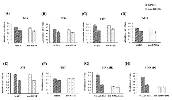 Evaluation by ELBIA of the binding activity of the biPROs and non-biPROs of eight proteins to Kwa: (A) BSA, (B) HSA, (C) γ-glo, (D) MSA, (E) AVI, (F) TBT, (G) MAb 2H2, and (H) MAb 1D2.
