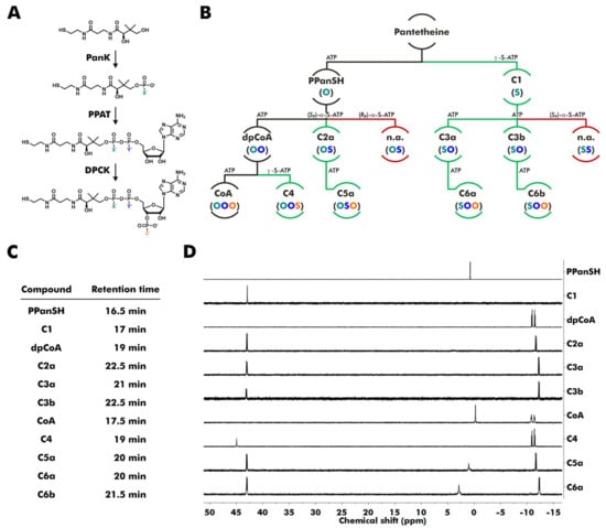 The Escherichia coli (E. coli) biosynthetic enzymes pantothenate kinase (CoaA, PanK), phosphopantetheine adenylyltransferase (CoaD, PPAT), and dpCoA kinase (CoaE, DPCK) have been widely used to synthesize dpCoA, CoA, and several CoA derivatives with modified cysteamine or β-alanine moiety from pantetheine (Figure 1A) [19,20,21,22,23,24,25,26,27,28]. All three enzymes utilize adenosine triphosphate (ATP) to introduce either a phosphate group or an adenosine monophosphate (AMP) moiety. Here, ATP was exchanged by thiophosphate analogs of ATP, and acceptance by the enzymes was evaluated (Figure 1B). γ-S-ATP replaced ATP in the phosphorylation reactions catalyzed by E. coli PanK and E. coli DPCK. One of the two possible diastereomers of α-S-ATP, (SP)-α-S-ATP or (RP)-α-S-ATP, replaced ATP in the AMP transfer catalyzed by E. coli PPAT.