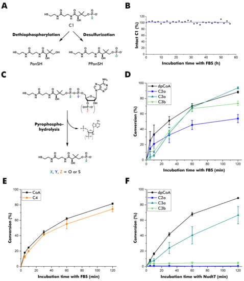 In mammals, CoA is degraded to PPanSH by ectonucleotide pyrophosphatases in serum or by the Nudix-type hydrolases Nudt7, Nudt8, and Nudt19 intracellularly [11,12,13,30,31]. By contrast, PPanSH is known to be fairly stable [5,32]. Likewise, C1 proved to be stable to dethiophosphorylation and desulfurization in fetal bovine serum (Figure 2A,B, Figure S1). The effect of different thiophosphate modifications on CoA pyrophosphatases was studied subsequently (Figure 2C). Since C5a, C6a, and C6b were prepared in insufficient yield, their precursor molecules on the dpCoA level were used instead in these experiments. Potential substrates were incubated with fetal bovine serum or human Nudt7, and the conversion was analyzed after conjugation to a fluorescent dye followed by RP-HPLC separation (Figure S2) [33].
