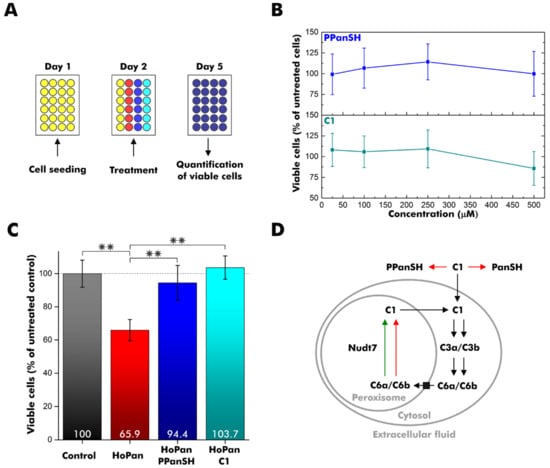 Supplementation of cell cultures with C1. (A) Experiment design overview. HEK 293T cells were seeded on day 1 and treated with calcium hopantenate (HoPan), PPanSH, C1, or a combination on day 2. Viable cells were quantified by a colorimetric cell proliferation assay on day 5. (B) Percentage of viable cells after growth in the presence of varying concentrations of PPanSH or C1 relative to untreated cells. (C) Percentage of viable cells after growth in the presence of 500 µM HoPan, 500 µM HoPan, and 25 µM PPanSH, or 500 µM HoPan and 25 µM C1 relative to untreated cells (control). The statistical analysis was carried out by two-sample t-test (n = 6), and double asterisks (**) represent a p-value < 0.01. (B,C) Error bars represent the standard deviation (n = 6). (D) Simplified scheme for the intracellular fate of C1. Red arrows indicate non-conversion. The green arrow indicates conversion. Black arrows are still hypothetical. PanSH: pantetheine.