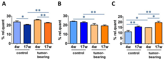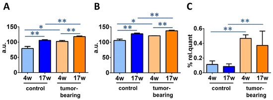 | tumor-bearing 17w | 0.178 ± 0.031 | 0.140 ± 0.020 | 0.245 ± 0.025 3,* | 0.136 ± 0.012 3,* | 1.903 ± 0.234 | 0.216 ± 0.046 |