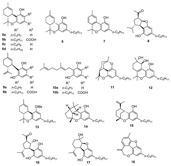Apart from Δ9-THC lower and higher homologues, which basically duplicate the CB1-CB2 activating ratio of the parent compound [13,14], most minor phytocannabinoids show higher affinity for CB2 compared to CB1 [17]. Significant activity in binding and functional assays has been reported for the acidic phytocannabinoids Δ9-THCA-A (5b) and CBDA (9b), with CBDV (9a) showing minor potency [17]. (−)-cis9-THC (6) [16], CBDV (9a), CBN (7) and anhydrocannabimovone (8) [18] showed significant activity in binding assays. Marginal activity was, conversely, reported for CBGA (10b), as well as for other minor phytocannabinoids [17].