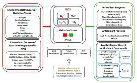 Environmental factors, such as radiation (ultraviolet, ionizing), tobacco smoke, xenobiotics and other pollutants as well as infections, are inducers of ROS generation and oxidative stress (Figure 1).