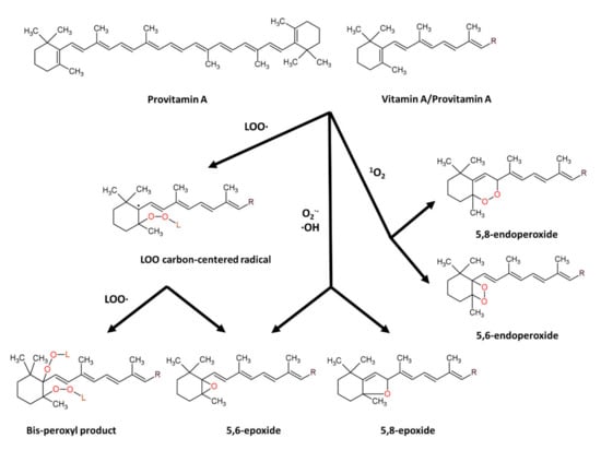 β-carotene (β-C) is a non-oxygenated carotenoid molecule, with 40 carbons, 11 conjugated double bonds and 2 β-ionone rings (Figure 2), possessing provitamin A activity [147,148]. β-carotene is an antioxidant molecule serving as a quencher of singlet oxygen and a scavenger of peroxyl radicals. The physical quenching of singlet oxygen is carried out by transferring excitation energy from singlet oxygen to carotenoid molecule, to generate excited triplet-state β-carotene and ground-state oxygen. Subsequently, the energy is dissipated between the excited β-C and the surroundings to yield normal energy state carotenoid and thermal energy [147,148]. The chemical quenching of singlet oxygen is carried out by oxygenation of β-carotene with the formation of β-C endoperoxides [149,150]. The scavenging of peroxyl radicals is carried out by addition of peroxyl radical to a suitable double bond in provitamin A/vitamin A molecules resulting in formation of carbon radical that can further undergo the conversion into epoxides or react with new peroxyl radical to form bis-peroxyl products [71,151,152]. β-carotene also showed scavenging activity towards superoxide anion radical, hydroxyl radical and hydrogen peroxide [153], and reaction of carotenoids with superoxide anion or hydroxyl radical results in formation of carotenoid epoxides [154,155].