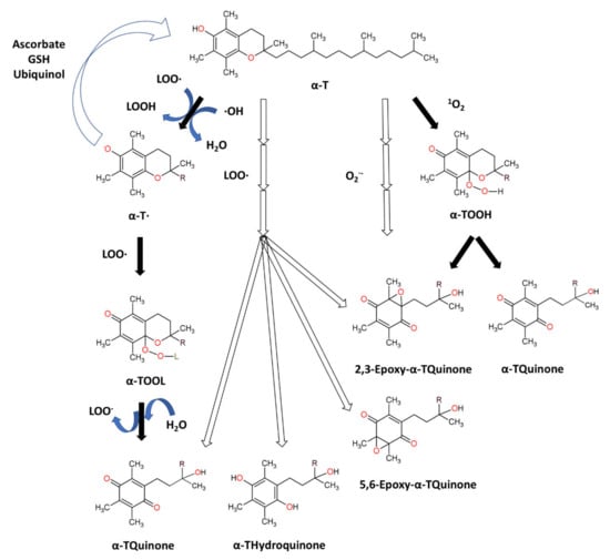 Tocopherols are plant-derived lipid-soluble molecules, possessing a chromanol ring and a saturated 16-carbon atom phytyl chain, that belong together with tocotrienols to the group of vitamin E. There are four isoforms of tocopherol (α-, β-, γ-, δ-), differing in the number of CH3− group substitutions on chromanol ring. Tocopherols can be distinguished from tocotrienols, which possess an unsaturated phytyl (farnesyl) chain. α-Tocopherol (α-T) (Figure 3) is an antioxidant that functions as a “chain breaker” during lipid peroxidation in cell membranes and various lipid particles [71]. α-T terminates the lipid peroxidation chain reactions by donating its phenolic hydrogen atom to a lipid peroxyl radical (LOO•), leading to the formation of lipid hydroperoxide (LOOH) and α-tocopheroxyl radical [71,156]. The formed tocopheroxyl radical, insufficiently reactive to initiate lipid peroxidation, can react with another lipid peroxyl radical (LOO•) to yield a non-radical product α-tocopherylquinone [152,156]. The tocopheroxyl radical can be also regenerated to tocopherol via reduction by ascorbate and glutathione [71] or ubiquinol [157]. α-T can also react with hydroxyl radical to form the tocopheroxy radical [158], and react with superoxide [159] or singlet oxygen [160] to form α-tocopheryl quinones, including α-tocopheryl quinone epoxide [161,162].