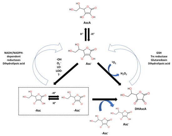 Ascorbic acid (AscA), also called vitamin C, is a water-soluble ketolactone with two ionizable hydroxyl groups. AscA exists in a form of monoanion ascorbate or can undergo oxidation to dehydroascorbic acid (DHAscA) [163,164]. Ascorbic acid is a potent antioxidant by scavenging oxygen radicals (Figure 4). Ascorbate, a prominent form of vitamin C at physiological pH, reduces radicals (superoxide, hydroxyl radical, alkoxyl radical, peroxyl radicals, tocopheroxyl radicals) by donating an electron, and in turn forming the ascorbate radical [163]. Ascorbate can also donate two electrons to singlet oxygen, resulting in the formation of DHAscA and H2O2 [165]. Ascorbate radical can undergo reaction with another ascorbate radical to yield ascorbate and DHAscA [71]. Ascorbate can be also regenerated from ascorbate radical via NADH/NADPH-dependent reductases, and from DHAscA by glutathione, thioredoxin reductase and glutaredoxin [163,166]. Dihydrolipoic acid is capable of reducing dehydroascorbic acid to ascorbate, and can also reduce ascorbate radical [167].