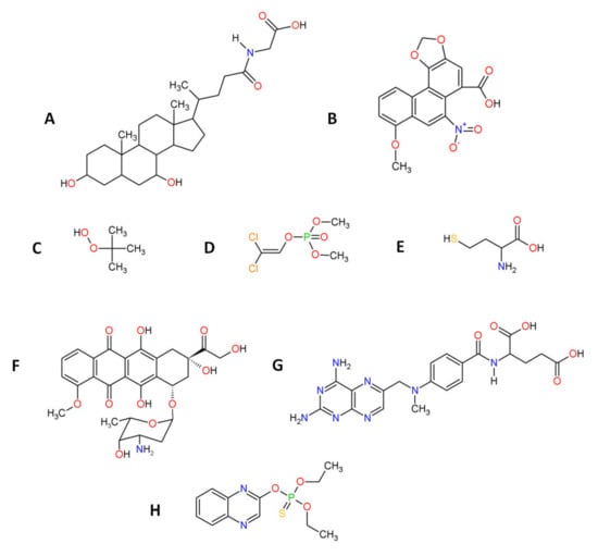 Exemplary organic stress inducers used during in vitro and/or in vivo tests. Structures of glycochenodeoxycholic acid (A), aristolochic acid (B), t-BuOOH (C), dichlorvos (D), homocysteine (E), doxorubicin (F), methotrexate (G) and quinalphos (H).