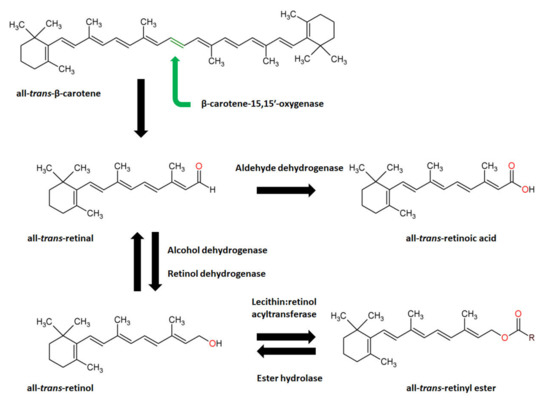 Carotenoids, such as β-carotene, are lipid soluble tetraterpenoid molecules naturally found in plants and microorganisms (algae, yeast and some bacteria), and available in food. In mammals, lipid-soluble β-carotene is absorbed in small intestine and delivered to the peripheral tissues (liver, adipose tissue, kidney, skin, lungs) via various lipoprotein particles. In one of the possible mechanisms for vitamin A synthesis (Figure 6), all trans β-carotene, the predominant form of β-carotene found in nature, is symmetrically cleaved by the enzyme β-carotene-15,15′-oxygenase (CMOI) to yield two molecules of retinaldehyde. Ingested β-C can be cleaved via CMOI in intestine and in various tissues within the body. Retinaldehyde can be reduced via alcohol dehydrogenase or retinol dehydrogenase to retinol, a vitamin A. Retinol can be also esterified via lecithin:retinol acyltransferase (LRAT) to retinyl esters, which constitute vitamin A reserves. Retinaldehyde can be also oxidized, by enzymes (ALDH 1 or RALDH) from the aldehyde dehydrogenase 1 family, into all-trans retinoic acid which constitutes the biologically active form of vitamin A, responsible for transcriptional regulation [198,199].