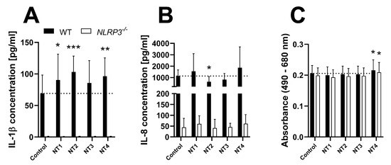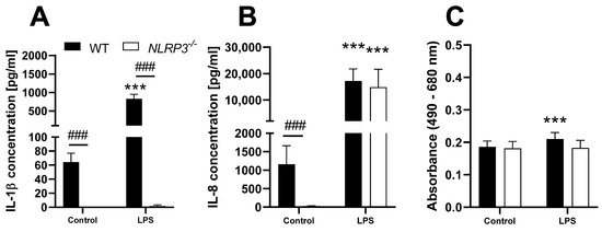 Release of IL-1β (A) and IL-8 (B), as well as LDH activity (C) in the supernatant of PMA-differentiated THP-1 WT (full bars) or NLRP3−/− (open bars) cells after 24 h treatment with 10 ng/mL LPS. Mean ± SD of N = 5, *** p < 0.001 compared to the respective control, ### p < 0.001 compared to WT cells.
