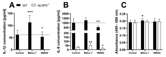 To further compare the applied model to published in vivo data, THP-1 WT and NLRP3−/− cells were treated with the two different MWCNTs, Mitsui 7 and NM400 (Figure 5). These MWCNTs were used in an in vivo study conducted by van Berlo et al. [31].