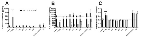 The following supporting information can be downloaded at: https://www.mdpi.com/article/10.3390/biom12081095/s1, Figure S1: Testing NLRP3−/− clones; Figure S2: TEM micrographs of PET nanoparticles; Figure S3: Microscopic images of PET microparticles; Figure S4: FT-IR absorbance spectra of PET; Figure S5: SEM images of PES; Figure S6: SEM images of PAN; Figure S7: SEM images of PA6; Figure S8: ELISA interference graphs; Figure S9: LDH interference graphs.
