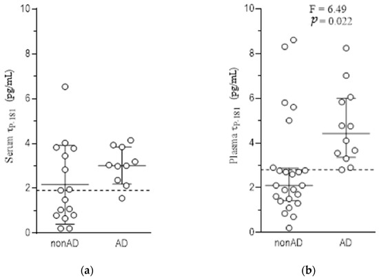Scatterplots of τP-181 levels in serum (a) and plasma (b). (a) In serum, levels did not deviate significantly from the normal distribution and, thus, bars indicate mean and standard deviation; (b) In plasma, they did not distribute normally, thus, bars indicate median and interquartile range. Broken horizontal lines indicate cut-off values suggested by ROC curve analysis. In contrast to serum levels, plasma levels differed significantly in AD, as compared to the non-AD group (2-way-ANCOVA with diagnostic group and sex as cofactors and age, disease duration and MMSE as covariates, after logarithmic transformation of original data).