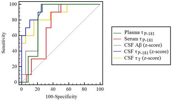 Analysis of ROC curves revealed statistically significant discrimination between the two studied groups by all biomarkers (Table 4 and Figure 2). No statistically significant difference was noted among the biomarkers (probably as a result of the small number of patients studied), with the notable exception of a superiority of CSF pT181-Tau over serum pT181-Tau. Plasma pT181-Tau showed a very good sensitivity, but a moderate specificity.