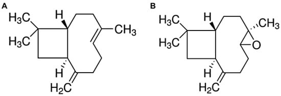 The sesquiterpene β-caryophyllene (CAR, Figure 1A) has been experimentally shown to contribute to the anti-inflammatory activity of some medicinal plants, especially of the genus Copaifera. Recent studies have described the mechanisms of CAR action in inflammatory processes, in particular, the action of CAR on the enzymes, cyclooxygenase-2 (COX-2), and lipoxygenase-5 (LOX-5), thereby reducing the release of inflammatory mediators, mitigating the symptoms of pain and edema, and highlighting its healing property [,,,,]. The broad pharmacological potential of CAR is highlighted in the reviews by Sharma et al. (2016), Francomano et al. (2019), and Rahimi and Askari [,,]. Additionally, studies have highlighted CAR as a promising compound for pain management owing to its action in the endocannabinoid system via selective interaction with cannabinoid 2 (CB2) receptors, thus providing analgesic action [,,].