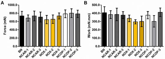Bioadhesive parameters of nanoemulgels of β-caryophyllene (NCARs), nanoemulgels of caryophyllene oxide (NOXs), and nanoemulgels of C. multijuga oleoresin (NCOPs). Force (mN) (A); Work of adhesion (mN.mm) (B). The nanoemulgels (n = 6/group) were put in contact with the skin by a force of 2.5 N for 180 s. After, the probe was lifted at a constant rate of 1.0 mm/s. Data are reported as mean ± SD and were statistically evaluated using one-way ANOVA followed by Tukey’s post hoc test (p > 0.05).