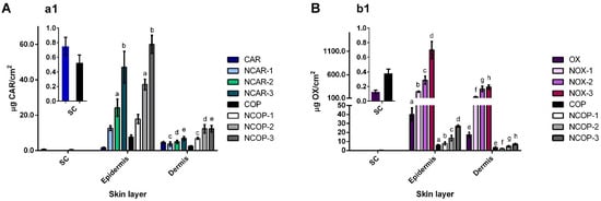 Cumulative amount permeated (µg/cm2) of β-caryophyllene (CAR) (A) and caryophyllene oxide (OX) (B) in skin layers with detailed permeation in the stratum corneum (a1,b1). The presence of CAR and OX was not detected in the samples of receptor fluid. Same letters mean the statistical difference between groups (n = 6/group) with proportional amounts of CAR and OX in the oily core, performed by one-way ANOVA followed by Tukey’s post hoc test (p < 0.001).