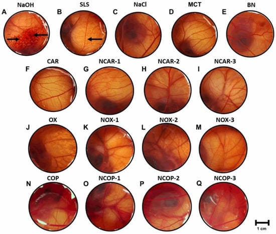 The preliminary safety profile of developed nanoemulgels was evaluated by the HET-CAM assay. Fertilized chicken eggs were incubated under controlled temperature and humidity (37.5 ± 0.5 °C and 60.0–70.0% humidity) for 10 days. The analyzed groups (n = 6/group) were 0.9% w/v NaCl (negative control), 0.1 M NaOH (positive control of hemorrhage and coagulation), 1.0% w/v sodium lauryl sulfate (positive control of vasoconstriction), MCT (diluent of COP, CAR, and OX), BN, 10.0% CAR in MCT, NCARs, 5.6% OX in MCT, NOXs, 24.9% COP in MCT, and NCOPs.