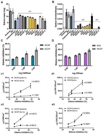 The conversion of the edema mass values into the percentage of edema inhibition can be seen in Figure 5C,D. NCOP showed a statistical difference in antiedematogenic activity compared to NCAR for medium and high concentrations. In Figure 5(c1,c2), the correlations between the edema inhibition and the amount of CAR permeated in the epidermis and dermis for NCAR and NCOP, respectively, are presented. Both NCAR and NCOP have a linear correlation in the epidermis, whereas a non-linear correlation was observed in the dermis for the NCOP samples. In a complementary way, in Figure 3A, a saturation of CAR in the dermis released from NCOP-2 and NCOP-3 was observed, which is reflected in the non-linear correlation (Figure 5(c2)). Similarly, a linear correlation is observed for the amounts of OX permeated in the epidermis from NOX and NCOP (Figure 5(d1,d2)). A possible saturation of OX in the dermis was also evidenced by a non-linear correlation (r = 0.7885) from the application of NOXs (Figure 3B and Figure 5(d1)).