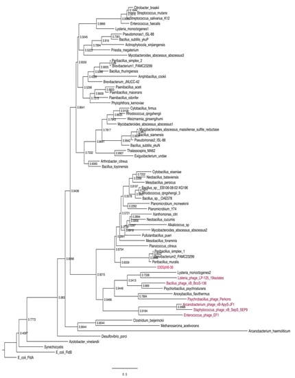 - Kostyk, N.; Chigbu, O.; Cochran, E.; Davis, J.; Essig, J.; Do, L.; Farooque, N.; Gbadamosi, Z.; Gnanodayan, A.; Hale, A.; et al. Complete genome sequences of Bacillus cereus group phages AaronPhadgers, ALPS, Beyonphe, Bubs, KamFam, OmnioDeoPrimus, Phireball, PPIsBest, YungSlug, and Zainny. Microbiol. Resour. Announc. 2021, 10, e0030021. [Google Scholar] [CrossRef] [PubMed]