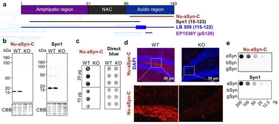 Nu-aSyn-C antibody is specific to aSyn. (a) Structure of human aSyn and antibodies against different aSyn epitopes applied in this study. (b) Denaturing WB analysis of brain lysates of WT and aSyn KO mice using Nu-aSyn-C and Syn1 antibodies demonstrates specificity of both antibodies to aSyn in WT mice. (c) Non-denaturing dot blot analysis of WT and aSyn KO mouse brains reveals immunosignals in WT mice only. An amount of 10–20 µg of total protein extract was loaded for WB (b) or dot blot (c). Loading of the total protein extract was controlled by CBB (WB, (b)) or using direct blue 71 dye (dot blot, (c)). (d) IHC analysis of WT and KO brain sections using the Nu-aSyn-C antibody shows specific immunosignals in WT brains only (example images from the hippocampus in d; example images from the cortex in Figure S1. (e) Dot blot analysis of human recombinant a-, b-, and gSyn using Nu-aSyn-C and Syn1 antibodies. Both antibodies do not cross-react with b- and gSyn.