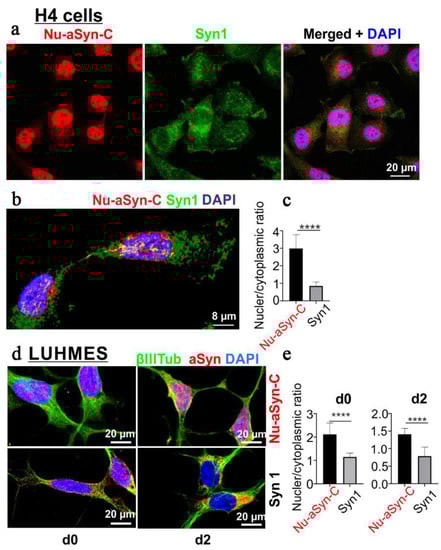 We next characterized the binding patterns of Nu-aSyn-C and Syn1 antibodies in cells. We performed ICC using immortalized H4 neuroglioma cells as well as LUHMES cells at the proliferating stage (d0) and after 2 days of differentiation (d2). Remarkably, the immunosignals of Nu-aSyn-C and Syn1 antibodies showed distinct distribution patterns (Figure 2): In proliferating H4 and LUHMES cells (d0) as well as in LUHMES cells differentiated for 2 days (d2), the Nu-aSyn-C antibody predominantly recognized nuclear aSyn, while the Syn1 antibody detected, to a larger extent, cytosolic aSyn.