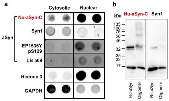 (a) Dot blot analysis of enriched cytosolic and nuclear fractions from H4 cells using different anti-aSyn antibodies, including Nu-aSyn-C, Syn1, EP1536Y (specific for phosphorylated aSyn on serine 129), and LB 509 (recognizing aggregated aSyn). GAPDH and histone 3 serve as protein markers of the cytosol and the nucleus, respectively. In H4 cells, nuclear aSyn exhibits a higher phosphorylated and aggregated status than cytosolic aSyn. (b) WB analysis of human recombinant aSyn (Rc-aSyn) and preformed aSyn oligomers. The Nu-aSyn-C antibody preferentially recognizes higher-molecular-weight oligomers.