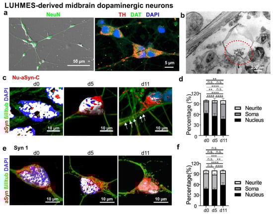 Since the Nu-aSyn-C antibody preferentially recognizes aggregated aSyn as well as nuclear aSyn in proliferating cells, we next asked whether Nu-aSyn-C-positive species are associated with distinct subcellular compartments during neuronal differentiation. To address this issue, we used at first LUHMES cells as a mDAN model. LUHMES cells are conditionally immortalized human fetal midbrain neurons that have the potential to differentiate into postmitotic neurons [23,37]. LUHMES cells differentiated for 5–11 days (Figure S3) expressed the neuronal marker NeuN as well as markers characteristic for dopaminergic phenotypes, such as TH and DAT (Figure 4a). EM analysis of LUHMES cells differentiated for up to 35 days showed the presence of putative synaptic sites, characterized by synaptic vesicle-like structures (Figure 4b). To determine subcellular localization of aSyn, we labelled proliferating LUHMES cells (d0) and cells differentiated for 5 (d5) and 11 days (d11) for aSyn (Nu-aSyn-C and Syn1 antibodies), neuronal marker class III beta-tubulin (βIIItub), and DAPI. Furthermore, 3D reconstructions were performed to distinguish aSyn in the nucleus from that in the soma or neurites (Figure 4c,e). After 5 days of differentiation, Nu-aSyn-C-positive immunosignals, which were predominantly present within the nucleus on d0, decreased in the nucleus and increased in the soma (Figure 4c,d). On d11, Nu-aSyn-C-positive signals along the neurites were significantly enhanced. Intriguingly, this Nu-aSyn-C-associated, differentiation-dependent shift of aSyn immunosignals from the nucleus to neurites was not detected in neurons labeled with Syn1 (Figure 4e,f), indicating a specific redistribution pattern related to Nu-aSyn-C-positive aSyn species.