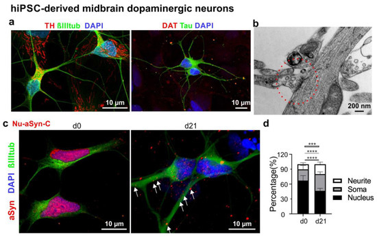 To verify the redistribution of Nu-aSyn-C-positive aSyn species during neuronal differentiation, we next performed ICC analysis of mDANs differentiated from hiPSCs using a small molecule-based differentiation protocol [22,29]. Neurons were differentiated from hiPSCs via small molecule-induced neural precursor cells (smNPCs) (Figure S3). Neurons differentiated from smNPCs for 21 days displayed neuronal markers, such as βIIItub and Tau, as well as specific makers for dopaminergic neurons, including TH and DAT (Figure 5a). Ultrastructural EM analysis of differentiated neurons showed distinct synaptic sites, comprising a presynaptic terminal with synaptic vesicles and a postsynaptic density (Figure 5b). Consistently with our observation in LUHMES cells, Nu-aSyn-C-positive species were predominantly present within the nucleus. In neurons differentiated for 21 days (d21), aSyn intensity in the nucleus was significantly attenuated, but within the soma and along the neurites it increased significantly (Figure 5c,d).