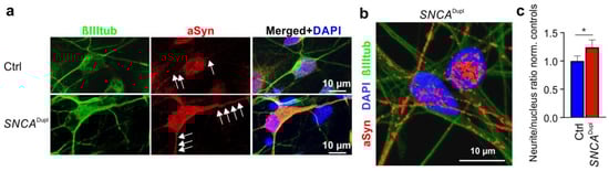 Our previous studies on SNCADupl mDANs derived from PD patients demonstrated neuritic deficits [22]. Since the Nu-aSyn-C antibody preferentially binds to aggregated aSyn, we next asked whether the nuclear/neuritic distribution pattern in differentiated mDANs is altered in SNCADupl mDANs, underlying the observed neuritic phenotype. We analyzed Nu-aSyn-C immunosignal patterns in mDANs differentiated from hiPSC lines of healthy controls and a SNCADupl patient using ICC. An enhanced aSyn level in SNCADupl neurons has been previously shown in our extensive studies on different SNCADupl cell lines, including cells from the patient analyzed in this study [22,28,38]. As expected, SNCADupl neurons are characterized by a remarkably intense staining of aSyn due to high aSyn expression levels, when compared to neurons from healthy controls (Figure 6a). Conspicuously, Nu-aSyn-C immunosignals along the neurites were stronger in SNCADupl mDANs than in controls (Figure 6a, white arrows). This effect is especially evident in 3D constructed images of SNCADupl mDANs (Figure 6b). We next asked whether the strong neuritic Nu-aSyn-C immunosignals were due to a general increase in aSyn levels in these cells or a result of disproportionate increase. For this, we calculated the Nu-aSyn-C fluorescence intensity ratios in the neurites versus nucleus of SNCADupl mDANs and normalized the ratios against those of control cells. To ensure that dopaminergic neurons were analyzed, we only focused on the neurons that were positive for both βIIItub and TH (Figure 6a and Figure S5). We detected a significantly increased neuritic/nuclear ratio of aSyn in SNCADupl mDANs (Figure 6c). This finding indicates a disproportional nuclear to neuritic shift of possibly aggregated aSyn, most likely triggered by a cell autonomous overexpression of aSyn.