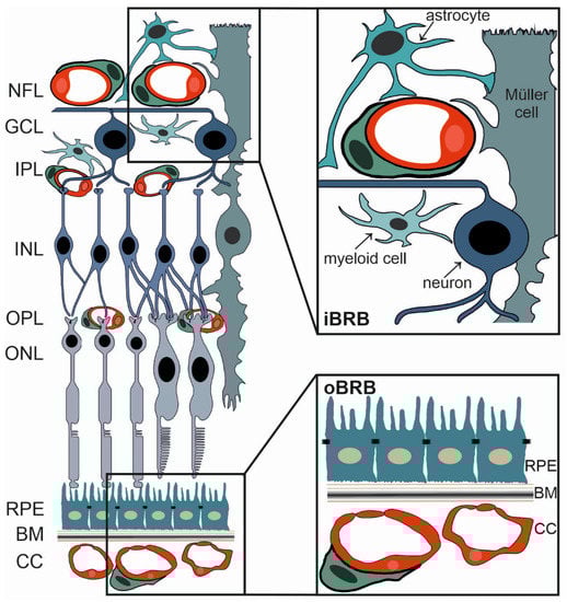 The retina is part of the central nervous system (CNS) [36], and therefore, shares considerable similarities with the brain. This could be demonstrated by characteristics such as the blood-retinal barrier (BRB), which shields retinal neurons from harmful, blood-borne substances comparable to the protection of brain neurons by the blood-brain barrier (BBB) [37,38,39]. The BRB tightly controls not only the flux of fluid and blood borne substances into and out of the retina, but also confers to obtain retinal immunoprivilege [40,41]. In primates and rodents, the inner retina obtains its blood supply from blood vessels dividing the central retinal artery to eventually form three capillary plexuses. These are located in the nerve fiber layer and in the inner and outer plexiform layers of the retina (Figure 1) [42]. Photoreceptors, however, are nourished by choroidal vessels that finally form a very dense capillary network. The choriocapillaris is adjacent to the extracellular matrix of the Bruch‘s membrane and the retinal pigment epithelium (RPE) [42] (Figure 1). Given the fact that the retina is supplied by two different vascular networks, two BRBs, the inner (iBRB) and outer BRB (oBRB), are also formed [43].