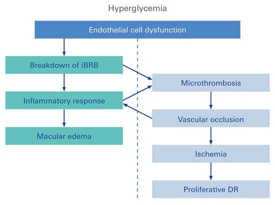 However, studies in cell cultures, animal models and human samples show clear evidence that not only the retinal vessels, but rather the retinal neurons, glia cells, the choroid, and RPE, are also affected by the metabolic and signaling challenges of diabetes [52,71,72,73,74,75]. Accordingly, retinal diabetic neuropathy is characterized by a degeneration of the inner retinal neurons and reduced neuronal function, even before DR becomes clinically symptomatic, e.g., preceding microvascular changes [76,77]. Experimental animals with diabetes show ultrastructural changes and a loss of tight junction integrity in the RPE [78,79]. Accordingly, an increased leakage of blood content can be observed in human diabetic patients and in diabetic animals indicating an alteration of the oBRB in DR [78]. Moreover, in particular, the observed neuroinflammation is not only a consequence of barrier dysfunction. It is also the result of an early local mechanism contributing to barrier alteration and leukostasis [19,56,57]. Accordingly, activation of microglia and Müller cells concomitant with secretion of inflammatory mediators was reported as an early observation in DR [60,80]. An increased expression of pro-inflammatory cytokines such as tumor necrosis factor (TNF)-α, the interleukins IL-1β, IL-6, IL-8, and CC-chemokine ligand 2 (CCL2), have been determined in human ocular samples, and could, moreover, be positively correlated with DR severity [43,57,81,82,83,84,85,86,87]. Moreover, exposure of endothelial cells to these pro-inflammatory cytokines leads to an increased expression of certain cell adhesion molecules (ICAM-1, VCAM-1 and E-selectin). They are suitable for the mediation of leukocyte docking and trespassing of the endothelial barrier [88]. Additionally of note is the fact that antioxidant application was reported to reduce levels of ICAM-1 and endothelial cell apoptosis in vitro [89]. Finally, the well-established potency of corticosteroid-based therapy for patients suffering from diabetes-associated macular edema is clearly a convincing argument for an involvement of inflammation in DR [19,67,68]. There is evidence that the benefits of corticosteroid treatment are not limited to macular edema, but may also slow the overall progression of DR [43,90,91,92].