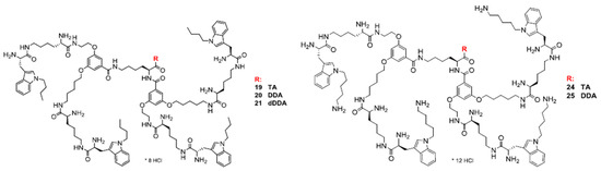 The antioxidant potential in terms of FRAP model for the studied compounds: +(8) charged 19–21 (N1-butyl-Trp terminated arms and tryptamine (TA), dodecylamine (DDA) or di-dodecylamine (DDDA) residue located at C-terminus)) and +(12) charged 24 and 25 (four N1-aminopentyl-Trp terminated arms and TA or DDA residue located at C-terminus) is shown in Figure 4. From the collection of dendrimers only compound 24 expressed a significantly higher TEAC value than the other compounds.