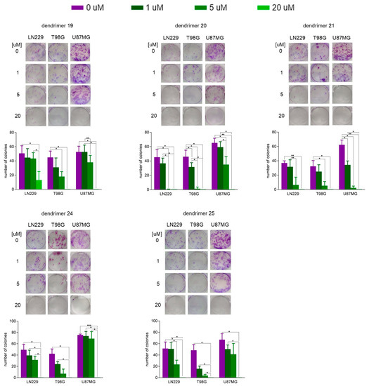 Influence of dendrimers on clonogenic potential of human glioblastoma LN229, T98G, and U87MG cells. Cells were treated with increasing concentrations (1, 5, and 20 µM) of dendrimer 19, 20, 21, 24, and 25 for 1 h. Subsequently, the dendrimer-containing medium was replaced with the fresh medium. After the next 14 days, colonies were stained and counted. Data are presented as mean ± SD (n = 3). * p < 0.05; ** p < 0.01; *** p < 0.005 (one-way ANOVA).