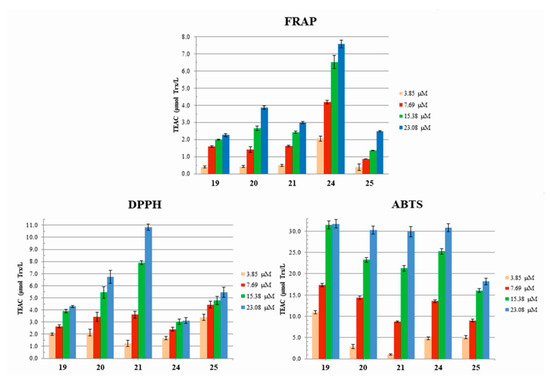 Antioxidant potential expressed as Trolox-equivalent activity (TEAC) of the selected 19–21 and 24, 25 dendrimers at four concentrations (3.85, 7.69, 15.38, and 23.08 µM) measured as ferric reducing antioxidant power (FRAP), neutral radicals scavenging ability (DPPH), or cationic radicals scavenging ability (ABTS) in relation to the known concentrations of Trolox.