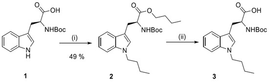 Synthesis of N1-Boc-1-butylotryptophan (3). (i) n-BuBr, NaOH, DMSO, 60 °C, 6 h; (ii) 1M NaOH, DMSO, r.t., 30 min.