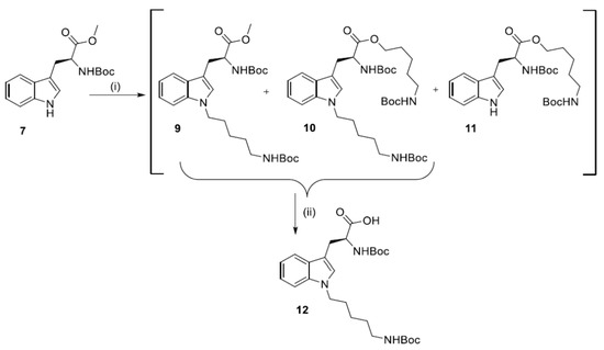 Synthesis of N1-Boc-1-[5-(Boc-amino)pentyl]tryptophan (12) was performed via N1-alkylation of Boc-Trp-OMe (7) with 5-(Boc-amino)pentyl mesylate and NaH at room temperature for 24 h (Scheme 3). The crude product obtained by extraction was immediately hydrolyzed in basic conditions. The pure product N1-Boc-1-[5-(Boc-amino)pentylo]tryptophan (12) was obtained in 35.8% yield by silica column chromatography. It was a highly hygroscopic white powder with 105.9–108.4 °C melting point.