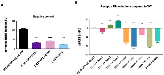 Receptor dimerization of MC4R chimeras compared to MC4R-WT. Dimerization of chimeric MC4R/CB1R receptors and H158R gain of function mutation was analyzed by performing NanoBRET™ assays. HEK293 cells were co-transfected with either BRET partners, C-terminally tagged with the energy donor NanoLuc or the protein tag HaloTag, able to bind the energy acceptor, the NanoBRETTM ligand 618. (A) CB1R is a non-interactive partner of MC4R and served as the negative control. Data are shown as BRET ratio in milliBRET units (mBU). (B) ΔBRET values were calculated as difference between BRET ratios of chimeras and MC4R-WT. Negative values represent a decrease in dimerization capacities compared to MC4R-WT dimerization. Data represent three independent experiments, each performed in triplicate. Values represent mean ± SEM of calculated BRET ratios. A one-way ANOVA with Kruskal–Wallis test was performed for statistical analysis, and the mean of the WT column was compared to the mean of all the other columns. Statistical significance was defined as ** p < 0.01, *** p < 0.001, and **** p < 0.0001.