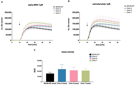 In a previous study, we presented data showing chimeric receptors exhibiting higher basal cAMP levels and higher NDP-alpha-MSH (a non-selective MCR agonist [23,28]) stimulated cAMP levels, compared to MC4R-WT [21]. Results were based on cAMP accumulation assays in COS-7 cells. In this study, we replicated the results for Chim 5, Chim 6, and Chim 7 in human HEK293 cells. Experiments were performed using GloSensorTM assay enabling dynamic live cell measurement of cAMP increase. In order to compare the results of this study with results previously achieved in COS-7 cells, we used the same concentration of 1 µM for alpha-MSH and setmelanotide. In the current study, effects of setmelanotide stimulation on cAMP production of chimeric receptors were evaluated. GloSensorTM results showed that alpha-MSH stimulation of Chim 5, Chim 6, and Chim 7 exhibited elevated cAMP production compared to WT (Figure 3A). A one-way ANOVA with Kruskal–Wallis test was performed, comparing area under the curve of MC4R-WT to Chim5, Chim 6, and Chim 7, stimulated with alpha-MSH or setmelanotide. The results turned out to be non-significant. The experiments were performed in triplicate of four independent experiments. This discrepancy might be explained by the different cell system and method used. Setmelanotide stimulation led to a similar increase in cAMP production in the chimeric receptors, compared to respectively alpha-MSH-induced cAMP increase (Figure 3B). Chim 5 to 7 exhibited qualitatively elevated basal cAMP levels compared to WT (Figure 3C).