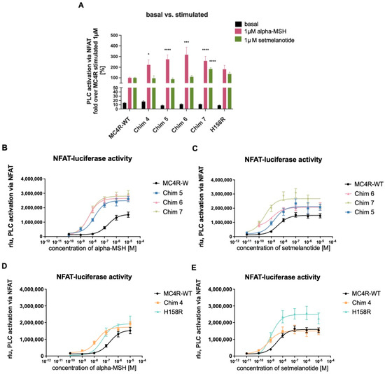 Gq/11 signaling of chimeric receptors and the H158R mutation compared to MC4R-WT. NFAT-reporter gene assay quantifying relative light units (rlu) to determine Gq/11 signaling capacities. HEK 293 cells were transfected with MC4R-WT, chimeric receptors, or H158R mutation. (A) Basal activity and 1 µM stimulated values of chimeric receptors and the H158R mutation compared to MC4R-WT. Basal activity of chimeric receptors is very similar to MC4R-WT. Chim 4, Chim 5, Chim 6, and Chim 7 displayed significant alpha-MSH induced increase in Gq/11 activity compared to alpha-MSH stimulated MC4R-WT. Values represent fold over 1 µM stimulated MC4R-WT. For statistical analysis, a one-way ANOVA with Kruskal–Wallis test was performed, comparing MC4R-WT to chimeric receptors and the H158R mutation. Values represent mean ± SEM. Statistical significance is indicated by * p < 0.05, *** p < 0.001, and **** p < 0.0001. Concentration response curves of Chim5, Chim 6, and Chim 7 cells were stimulated with different concentrations of (B) alpha-MSH or (C) setmelanotide. Concentration response curves of Chim 4 and H158R mutation were stimulated with different concentrations of (D) alpha-MSH or (E) setmelanotide. Data are given as raw rlu. Data represent WT (alphaMSH n = 10, setmelanotide n = 17), H158R (n = 4), Chim 4 (alpha-MSH n = 5, setmelanotide n = 7), Chim 5 (n = 4), Chim 6 (alpha-MSH n = 4, setmelanotide n = 3), and Chim 7 (alpha-MSH n = 9, setmelanotide = 10) experiments, each performed in triplicate. Values represent mean ± SEM. Emax and EC50 values are summarized in Table 1.