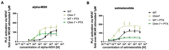 PLC activation can be a mixture of Gq/11 activation and activation of βγ-subunits of Gi/0 [29]. In order to determine whether the increase in PLC activation in chimeric receptors can fully be attributed to Gq/11 activation, additional NFAT experiments were conducted including MC4R-WT and Chim 7. Cells were pretreated with pertussis toxin (PTX), a Gi/0 inhibitor. In the presence of PTX, the Gi/0 subunits are locked in their inactivate state, blocking this pathway [30]. Concentration–response curves after alpha-MSH challenge in the presence of PTX demonstrated a similar efficacy for MC4R-WT compared to signaling in the absence of PTX. For Chim 7, a reduction in efficacy compared to non-PTX treatment (significant) was observed. A shift towards lower EC50 values, indicating a significant decrease in potency for Chim 7 occurred, but not for MC4R-WT (Figure 5A, Table 2). After setmelanotide stimulation, the potency was only decreased for MC4R-WT but not for Chim 7 when comparing non-PTX to PTX data. As for efficacy, MC4R-WT as well as Chim 7 exhibited reduced maximal signaling via Gq/11 in the case of Gi/0 blockage through PTX (Figure 5B, Table 2). Focusing on the alpha-MSH, the natural endogenous ligand of MC4R, PTX treatment appeared to affect receptor efficacy more than it affected receptor potency. The blocking of Gi/0 subunits led to a significant shift towards lower EC50 values for Chim 7 after alpha-MSH stimulation, indicating an increase in Gq/11 signaling for Chim 7.