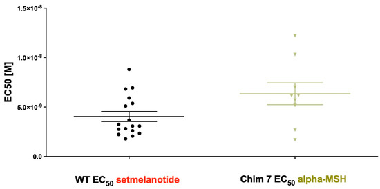 EC50 of Gq/11 signaling of MC4R-WT stimulated with setmelanotide compared to EC50 of Chim 7 stimulated with alpha-MSH. Concentration–response curves were used to determine potency. EC50 of MC4R-WT after setmelanotide stimulation (4.04 ± 0.5 nM) appeared similar to EC50 of Chim 7 after alpha-MSH stimulation (6.33 ± 1.1nM). Data are given as the result of 9 to 17 independent experiments performed in triplicate. Values represent mean ± SEM.