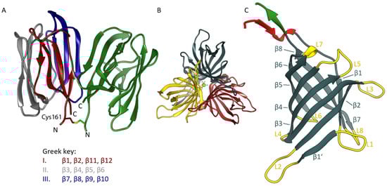 Structure of OsJAC1 domain proteins in ribbon representation. (A) JRL dimer as found in the asymmetric unit of both crystal forms, with one chain colored in grey, red, and blue, indicating the three four-stranded antiparallel β-sheets (Greek key motifs I–III), the other monomer is coloured green. The figure is based on coordinates from crystal form 1; N- and C-termini (at residues Gln160 and Pro305, respectively, of full-length OsJAC1) are labelled. The homodimer features a symmetric inter-subunit disulfide bond at Cys161. (B) DIR trimer constituting the asymmetric unit of both crystal forms. The figure was prepared using coordinates from crystal form 1, including a calcium ion (green) in the center. (C) β-barrel architecture of the DIR monomer (crystal form 1, chain B). Loops (labelled L1 through L8) are highlighted in yellow and β-strands (labelled β1 through β8) shaded in metallic. The adjacent N- and C-terminal segments are colored red and green, respectively.