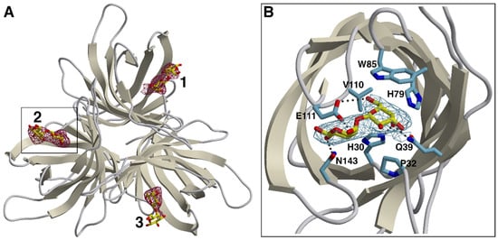 Complex crystals were obtained by incubating specimens of OsJAC1-DIR crystal form 2 with the β(1⟶4) variant of galactobiose, which we had previously identified as a high-affinity OsJAC1 ligand. The soaking procedure resulted in an overall increase of disorder, as evidenced by elevated B-factors and a reduction of useable resolution. Nevertheless, the disaccharide could be clearly identified by newly appearing difference density in all three chains of the DIR domain trimer (see Figure 2A for a-posteriori ligand verification). The binding site is located on the pole of the barrel opposite the N- and C-terminus, and consists of a widely accessible pocket, which is flanked by the differently sized loops L1, L2, L4, L6, and L8 (see Figure S10A,B). In this groove, the non-reducing unit of the galactobiose is precisely fitting and is able to interact through hydrogen bonding (prominently with His30 and Gln39, more weakly—as judged by non-hydrogen atom distances >3.2 Å in two out of three instances—with Glu111), and through van der Waals contacts (involving Pro32, His79, Trp85, and Val110; see Figure 2B and Figure S10C), on average burying 150 Å2 of solvent-accessible protein surface area. The reducing unit exhibits less contact with the protein, forming hydrogen bonds mainly with Glu111 and Asn143, which corresponds to approximately 90 Å2 of buried protein surface. The results of refinement indicate that ligand occupancy is close to stoichiometric for all three binding sites. Notably though, comparison with the structure of the original OsJAC1-DIR crystal form 2 did not reveal major conformational changes related to binding of the disaccharide.