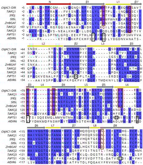 Figure 3 shows a sequence alignment of the DIR domain of OsJAC1 with different known MCJ and DIR proteins. The yellow bars correspond to the loops and the grey arrows to the β-strands of the OsJAC1-DIR domain. The investigation of potential ligand binding motifs based on those described for PsPTS1 [20] and OsJAC1 (this study) revealed two different conserved patterns (indicated by red and black frames in Figure 3). Specifically, BLAST searches with different algorithms (BLASTP, PSI-BLAST, and DELTA-BLAST [45,46]) showed that the carbohydrate-binding motif of the OsJAC1-DIR domain is mostly found in MCJ proteins and is highly conserved in this family, especially for the subgroup MCJ1 defined by Ma and Han (2021) [12]; AtDIR6, on the other hand, contains a signature similar to that in PsPTS1. These observations suggest that the DIR domains of the MCJ1 subgroup not only exhibit the same tertiary structure as the OsJAC1-DIR domain but are likely to also feature similar carbohydrate binding properties. TaMCJ2 and TaMCJ3 exhibit a slightly different sequence pattern at the binding area of the OsJAC1-DIR domain, which indicates a more distant evolutionary relation and possibly a different function.
