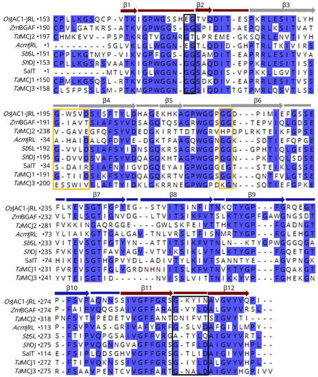 Sequence alignment (CLUSTAL OMEGA multiple sequence alignment [47]) of the OsJAC1-JRL domain with different MCJ and mJRL proteins. Bars correspond to the loops and arrows to the β-strands of the OsJAC1-JRL domain (coloring indicates the three four-stranded antiparallel β sheets (Greek key motifs I–III) as in Figure 1A). Black and yellow frames denote residues of proposed binding site I and binding site II, respectively, of the OsJAC1-JRL domain. Conserved regions (>50% identity) are shaded in blue. The sequences correspond to proteins from Zea mays (ZmBGAF), Triticum aestivum (TaMCJ1, -2, -3), Ananas comosus (AcmJRL), Sorghum bicolor (SbSL) Saccharum hybrid (ShDJ), and Oryza sativa (SalT).